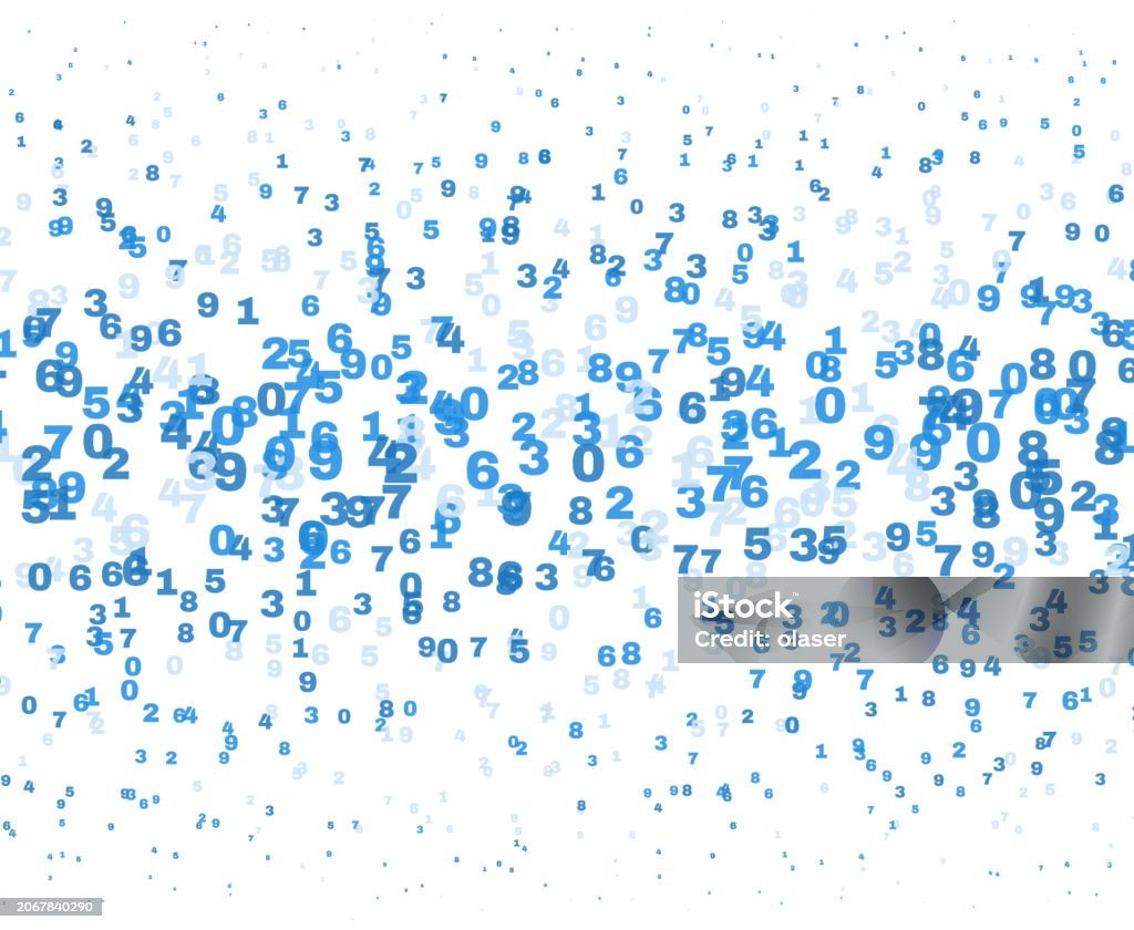A digital illustration of randomly scattered blue numbers varying in opacity on a white background.