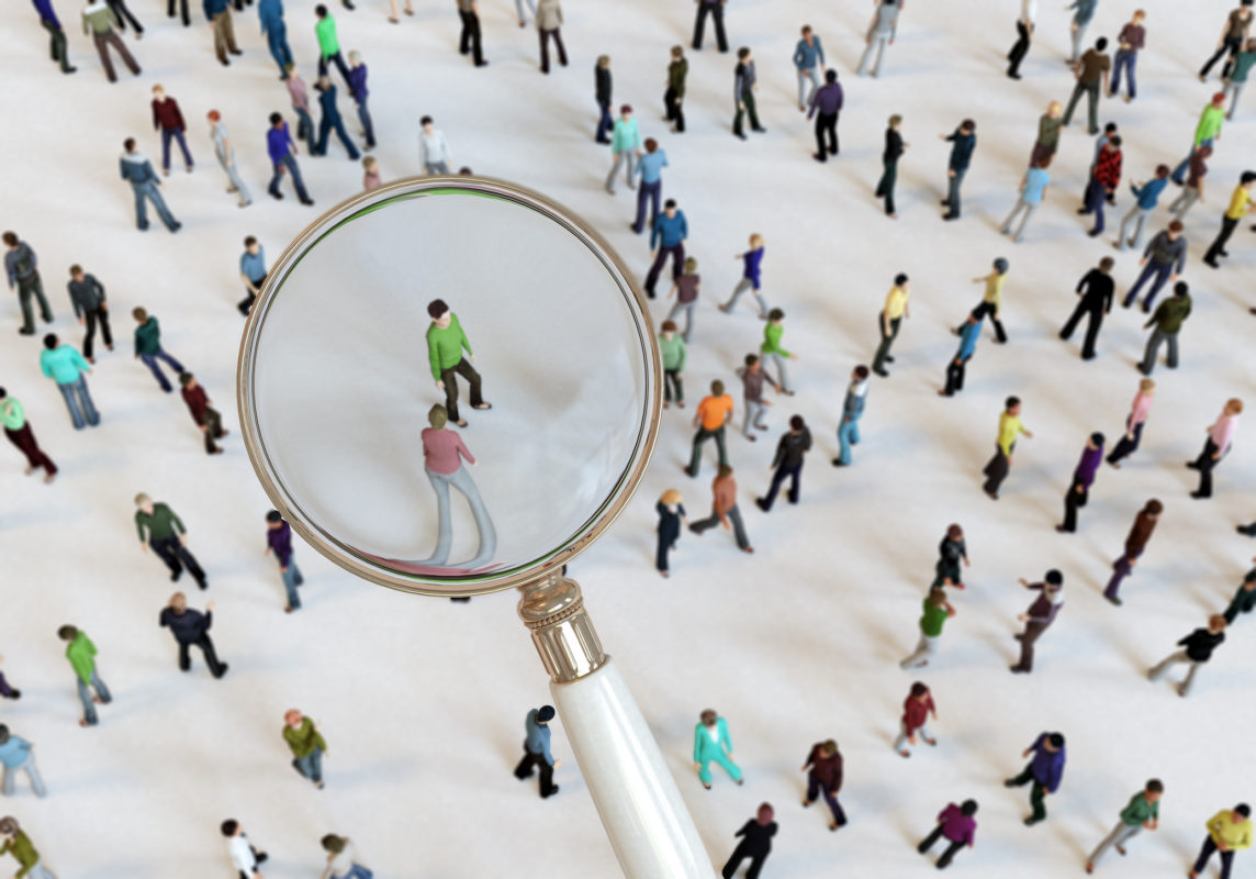 Zoom in with magnifying glass on crowd of people. ( 3d render )