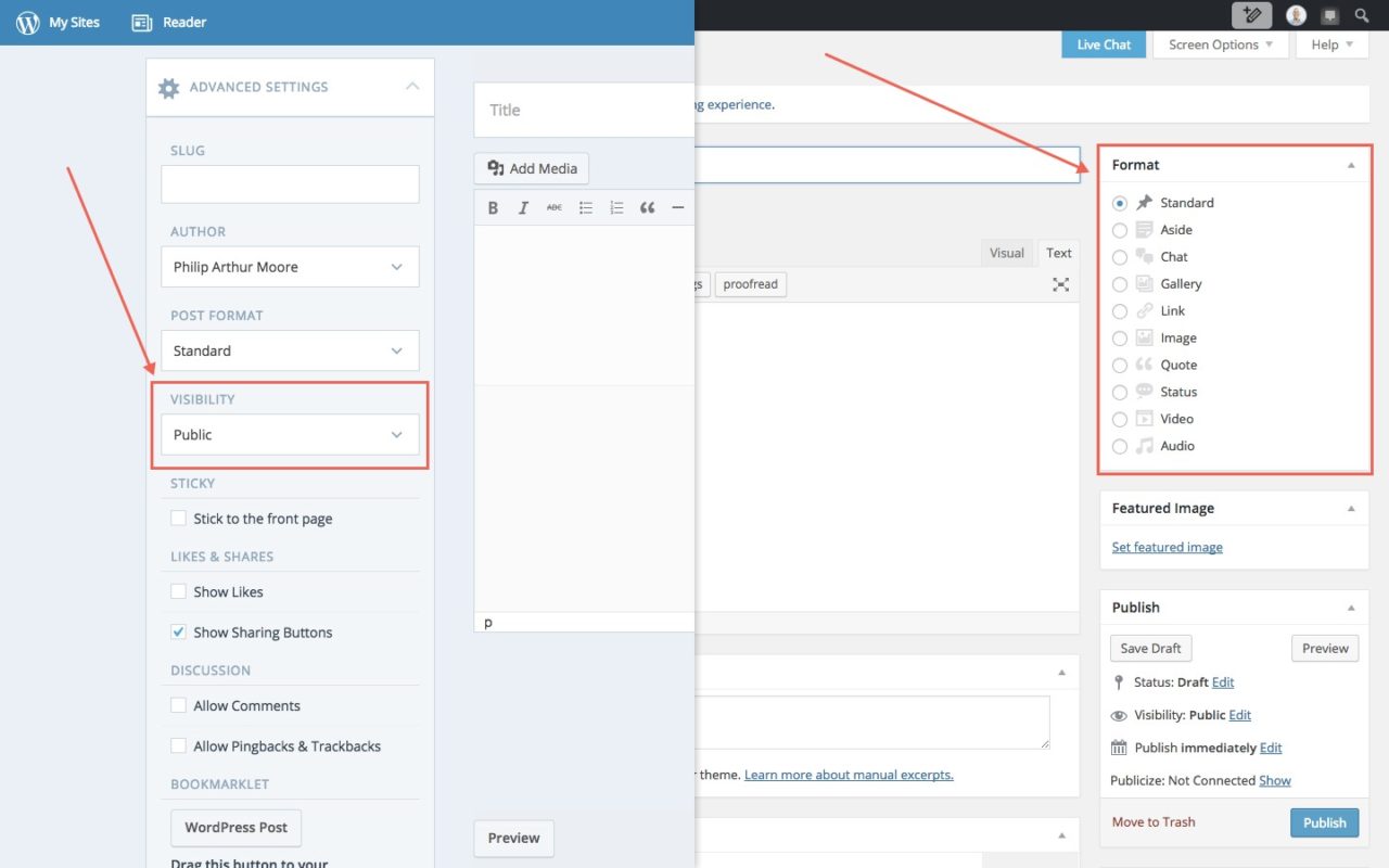 Left: The new posting experience on WordPress.com. Right: The classic WordPress post experience on WordPress.com.