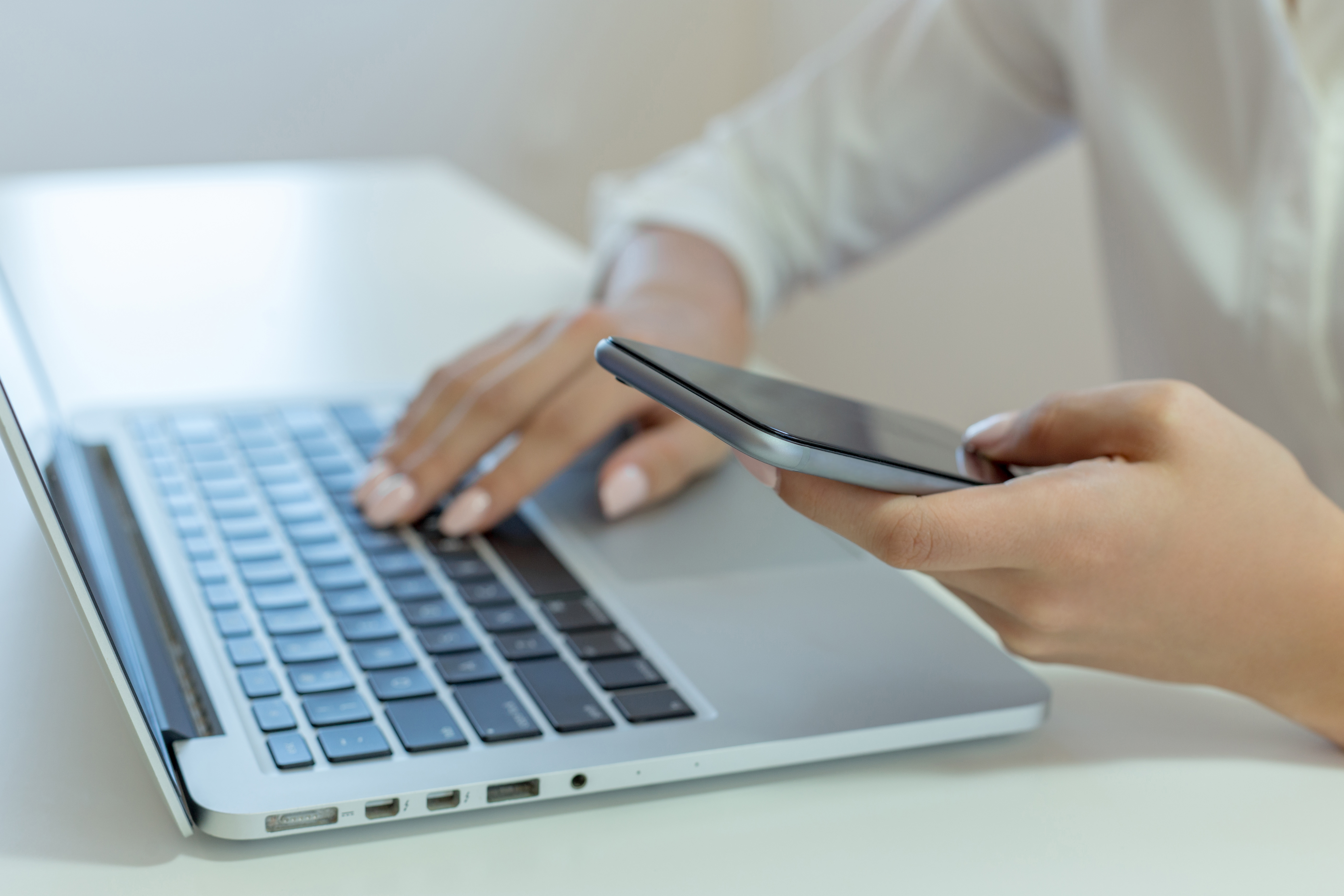 Woman holding mobile phone and using laptop