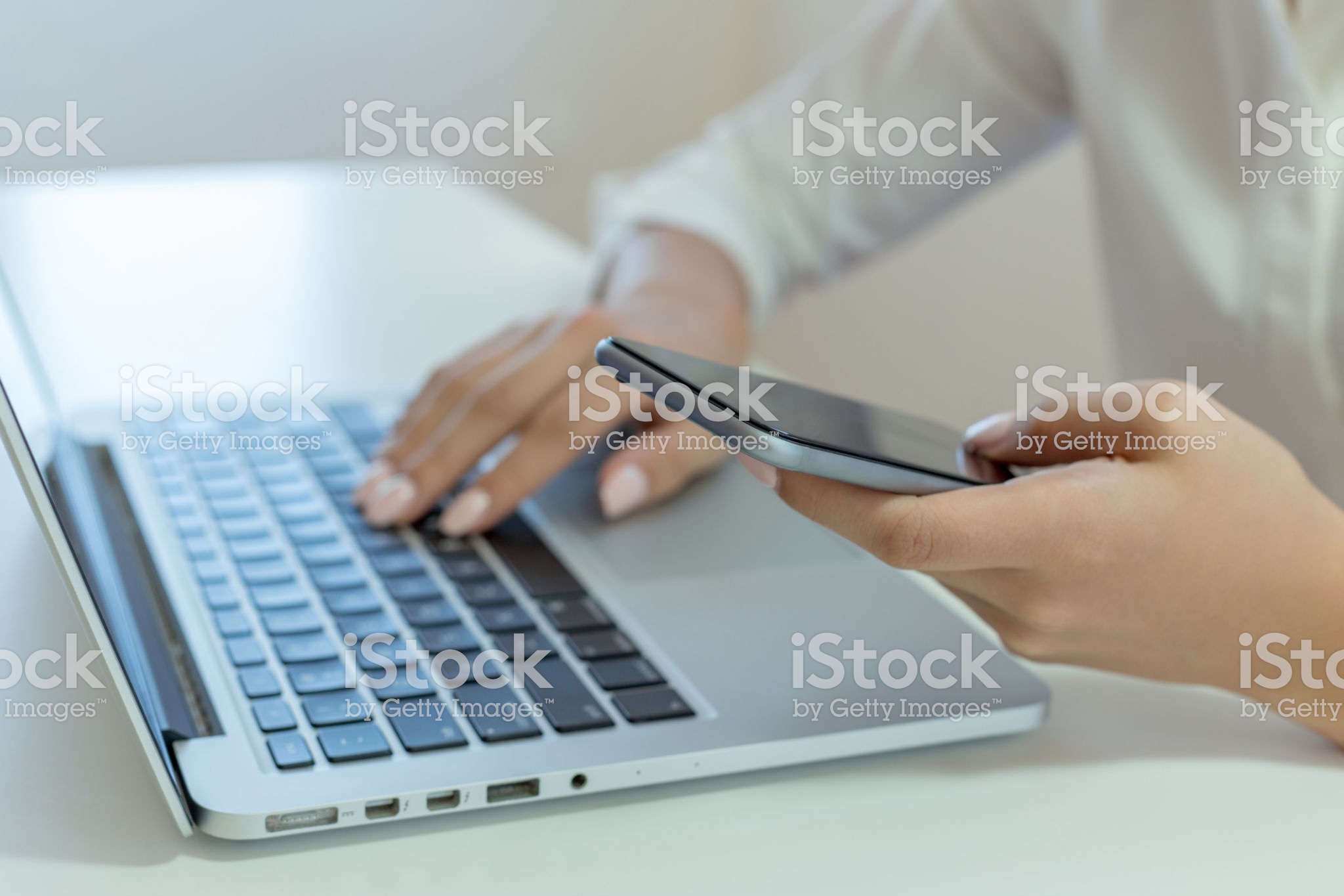 Woman holding mobile phone and using laptop